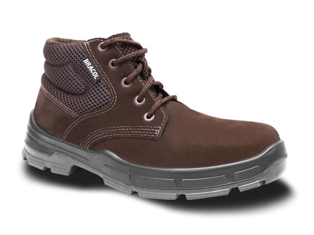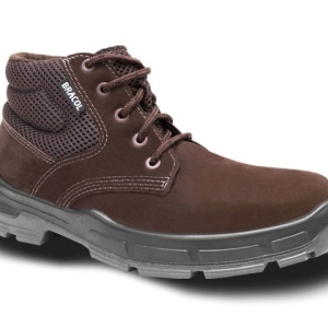 Calçado ocupacional de uso profissional, tipo botina, fechamento em cadarço, confeccionado em couro nobuck, palmilha de montagem em material sintético, biqueira de conformação, solado de poliuretano bidensidade antiderrapante injetado diretamente no cabedal, sistema de absorção de energia na região do salto, resistente ao óleo combustível.