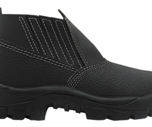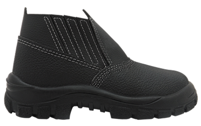Calçado de segurança, fechamento com elástico lateral, confeccionado em couro raspa na cor preta, biqueira de aço, resistente ao óleo combustível e ao escorregamento.