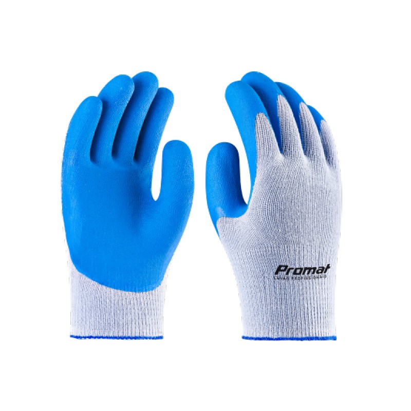 Luva de segurança confeccionada em fios de poliéster e poliamida tricotados em uma só peça, com revestimento externo em borracha látex natural na face palmar, acabamento em overloque, punho com elástico.