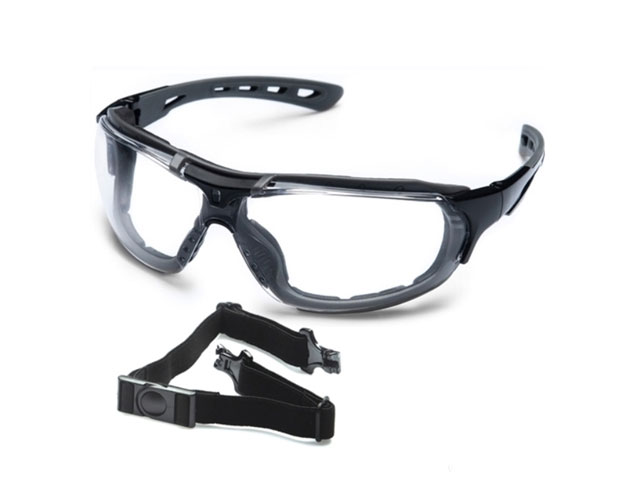 Armação e revestimento interno pretos, hastes pretas com cinza, semi-haste com elástico preto e visor incolor e cinza.